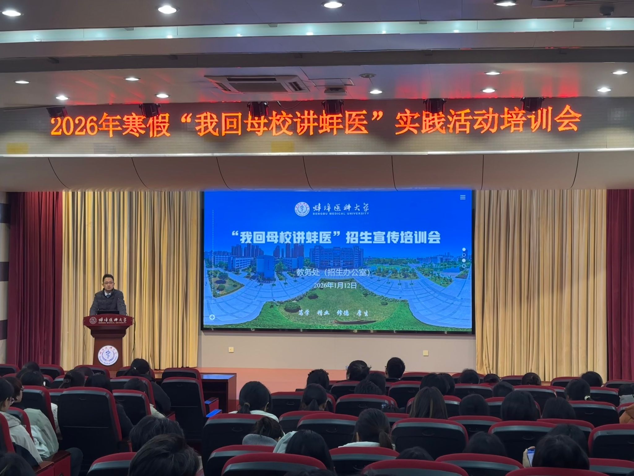 为做好2026年本科招生工作,充分发挥在校学生的桥梁纽带作用,1月12日,教务处组织召开了2026年寒假“我回母校讲蚌医”专项实践活动培训会。