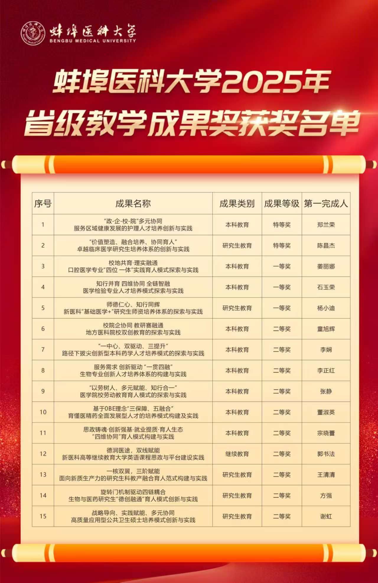 近日,安徽省教育厅公布2025年高等教育教学成果奖获奖名单,我校本科教育和继续教育、研究生教育教学成果奖再创佳绩,共获特等奖2项,一等奖3项,二等奖10项。